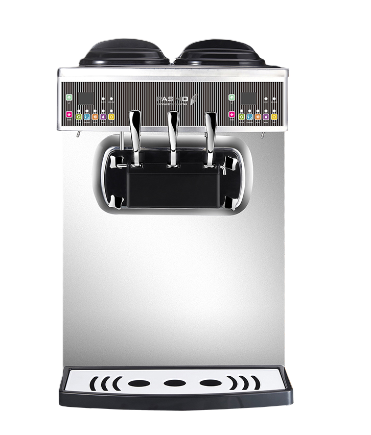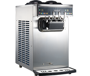 Máquina profesional para fabricar helado suave o frozen yogurt de 3 boquilla, 2 sabores y 1 combinado de mostrador. Sistema dual independiente, rendimiento estable de los cilindros, dos motores, dos ventiladores y dos condensadores.