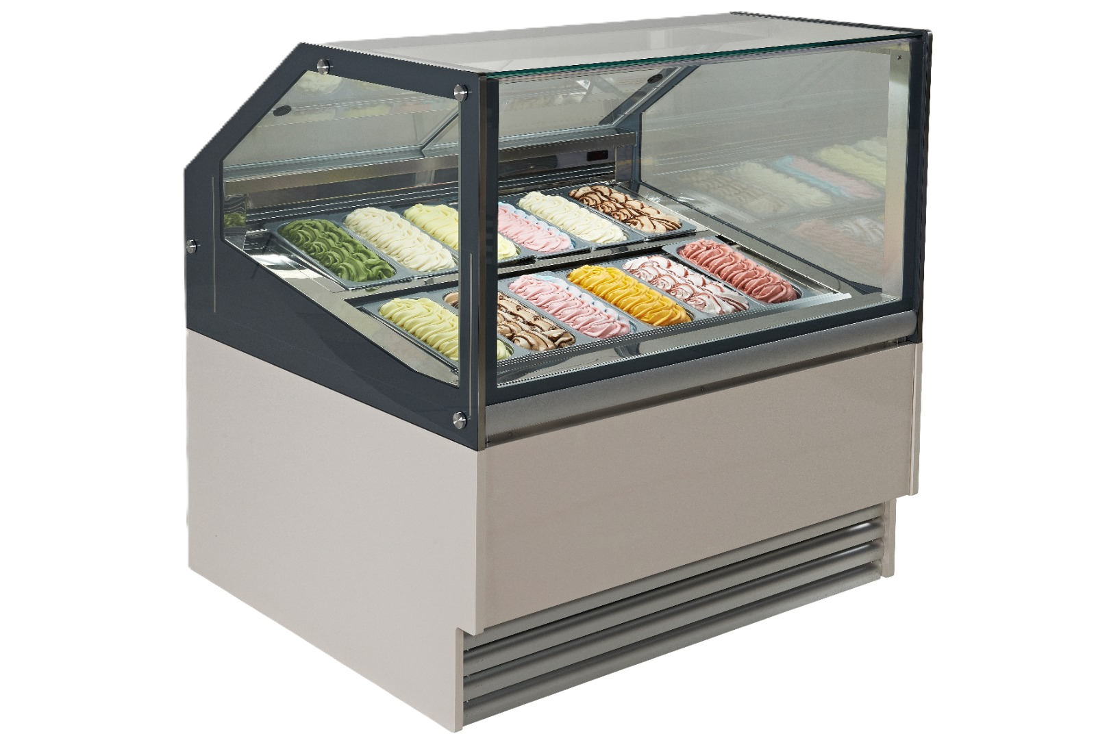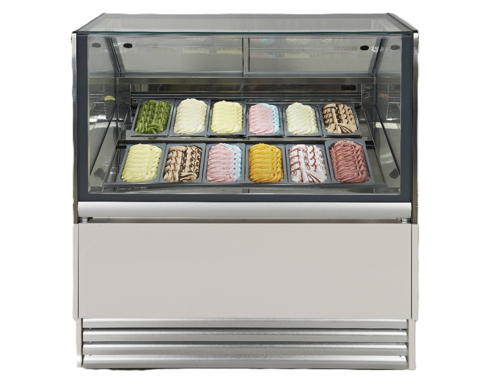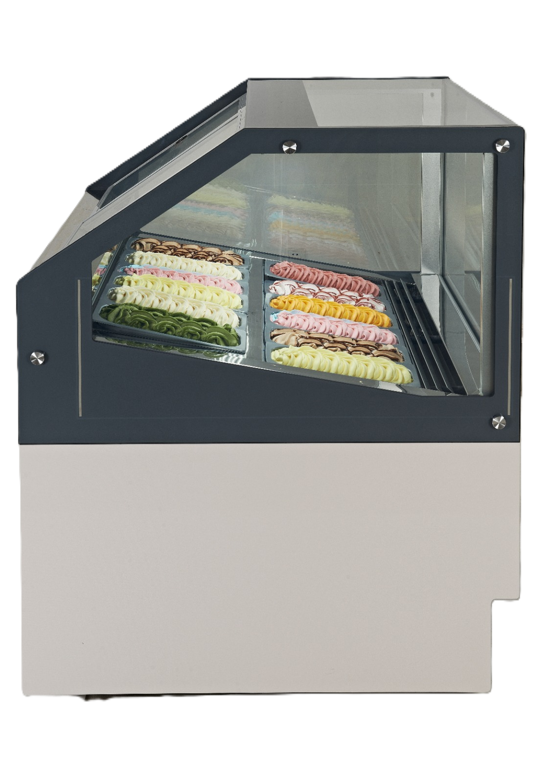 Diseño elegante para exhibir 12 bandejas de Gelato. Sistema de enfriamiento por aire con doble conducto, enfriamiento rápido y temperatura uniforme.